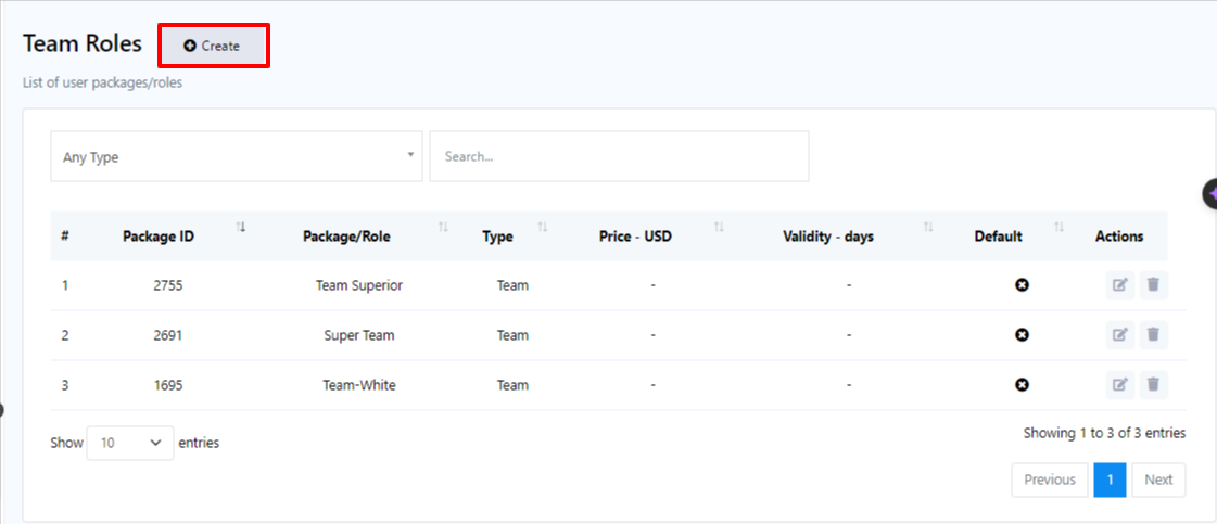 - Dentro del menú Rol del equipo, haga clic en el botón "Crear".