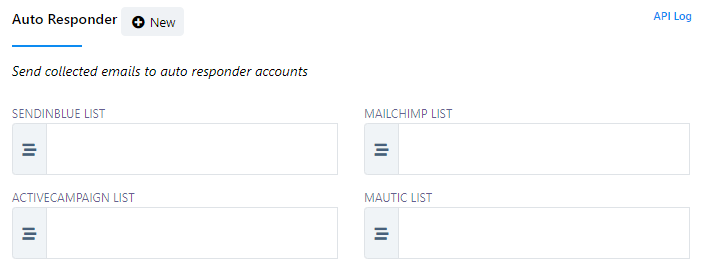 En esta sección, encontrará varios campos para configurar listas específicas, como "Lista de Mailchimp", "Lista de Sendinblue", "Lista de ActiveCampaign", "Lista de Mautic" y "Lista de Acelle". Estos campos le permiten definir dónde se almacenarán las direcciones de correo electrónico recopiladas según el servicio de respuesta automática que haya elegido.