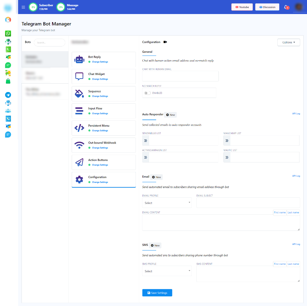 Para empezar, accede a la página del Administrador de Bots desde el Panel de Control. Haz clic en la opción "Configuración".