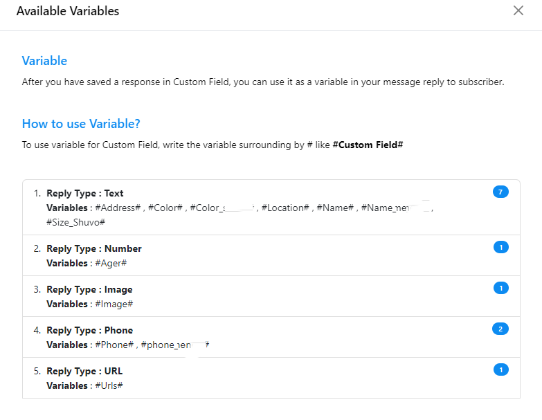 Variables personalizadas: dentro del menú "Opciones", encontrará instrucciones sobre cómo utilizar variables personalizadas y una lista de variables personalizadas disponibles para su conveniencia.