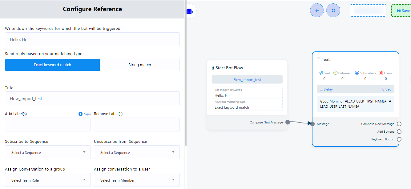 Importación de Flujo: La Importación de Flujo es el proceso equivalente a la Exportación de Flujo. Consiste en importar un flujo de bot previamente guardado o creado externamente, generalmente en formato `.txt`, al generador de flujos de bot. Esto permite a los usuarios integrar rápidamente flujos conversacionales predefinidos y estructuras de bot en sus proyectos sin necesidad de recrearlos manualmente. La Importación de Flujo simplifica la configuración de chatbots al incorporar flujos de bot preexistentes.