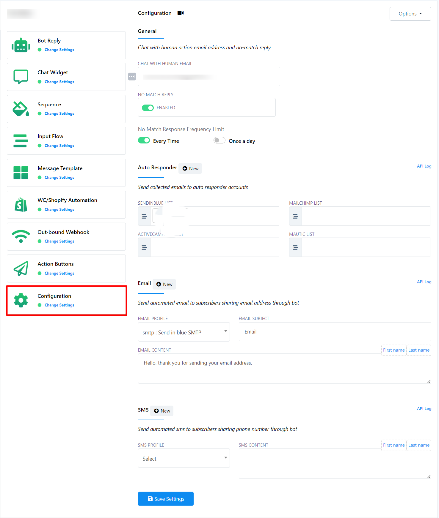 En la sección Integración de correo electrónico, los usuarios pueden configurar una dirección de correo electrónico predeterminada. Esta dirección enviará automáticamente correos electrónicos a las direcciones recopiladas mediante las interacciones del bot. Para configurar esto, los usuarios deben seleccionar un perfil de correo electrónico creado previamente en la sección Integración. Estos perfiles de correo electrónico se pueden vincular a diversos proveedores de envío de correo electrónico, como SMTP, Mailgun, Postmark, SES y Mandrill.