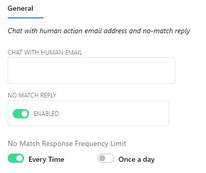 El límite de frecuencia de respuesta de no coincidencia para una cuenta de bot es el número máximo de veces que el chatbot puede responder con una "Plantilla de no coincidencia". En este caso, si el botón "Cada vez" está activado, el chatbot enviará la "Plantilla de no coincidencia" cada vez que no pueda identificar la respuesta correcta. En el otro caso, si el botón "Una vez al día" está activado, el chatbot enviará la "Plantilla de no coincidencia" solo una vez al día si no puede encontrar la respuesta correcta.