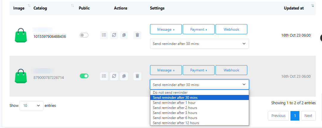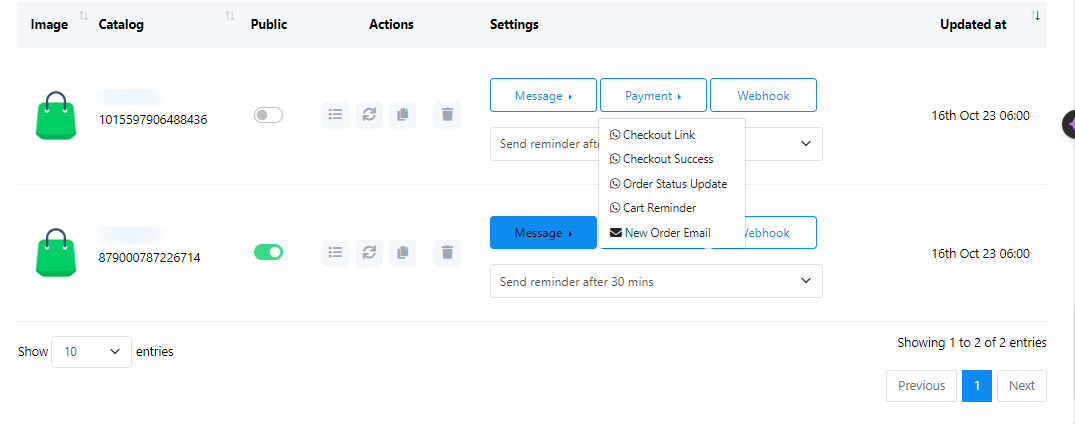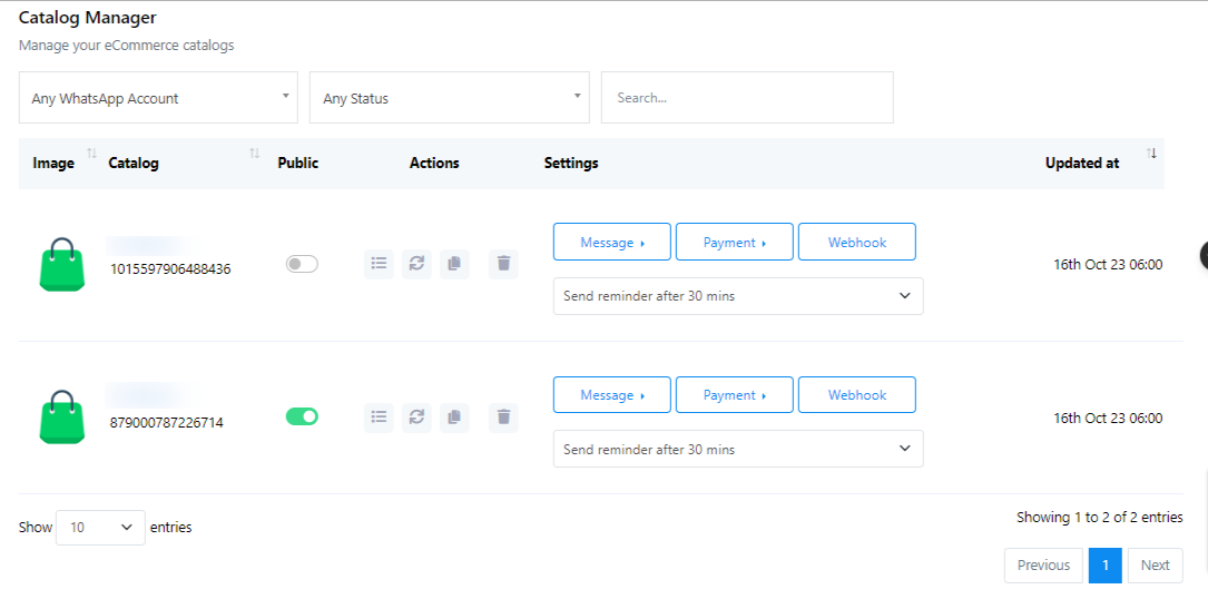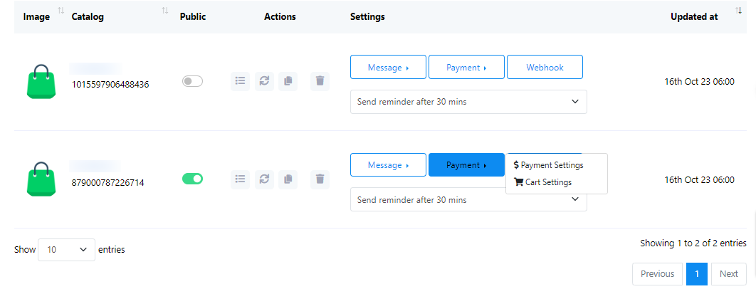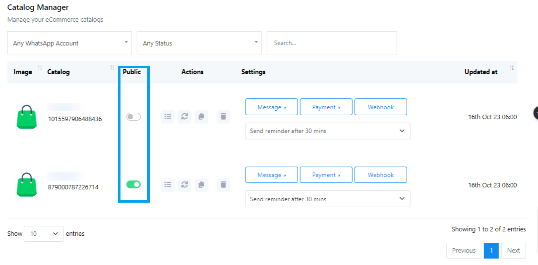 - Encontrará el nombre y el ID del catálogo. Hay una opción para habilitar o deshabilitar el estado público.