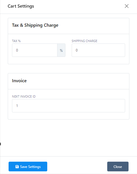 - Configure los ajustes del carrito, incluido el porcentaje de impuestos y los gastos de envío.
